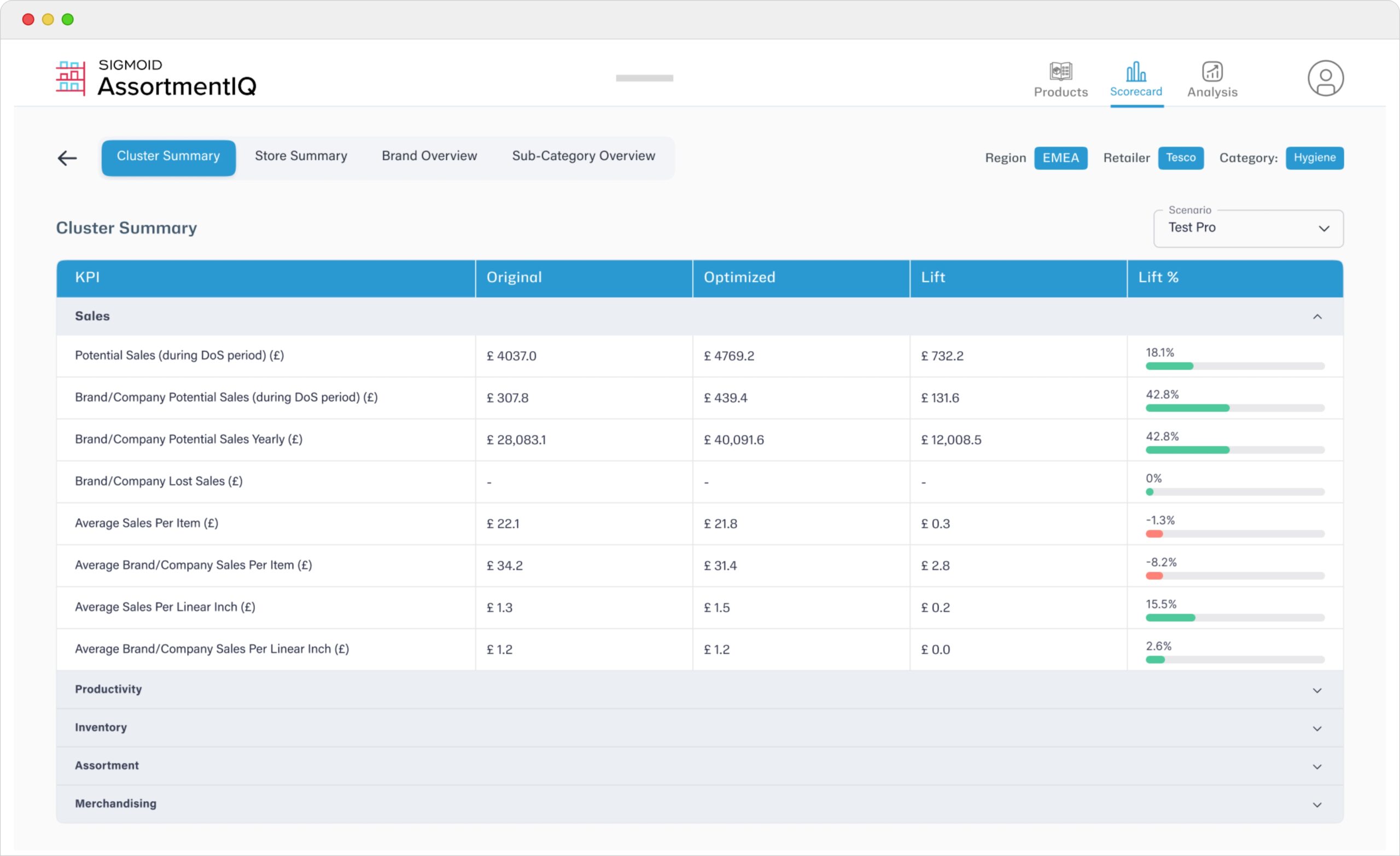 Model assortment scenarios using an interactive interface to test SKU-level changes and instantly assess their effect on shelf share, brand presence, and performance KPIs.