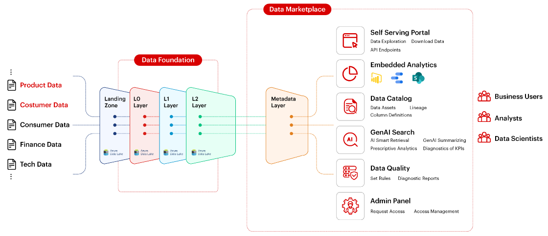 - Data foundation: The Silver layer of the architecture includes processes for data standardization, table linings, and the integration of analytics applications and model plugs. This ensures standardized data, facilitating consistency and easing the integration of analytics tools and machine learning models seamlessly into the marketplace.