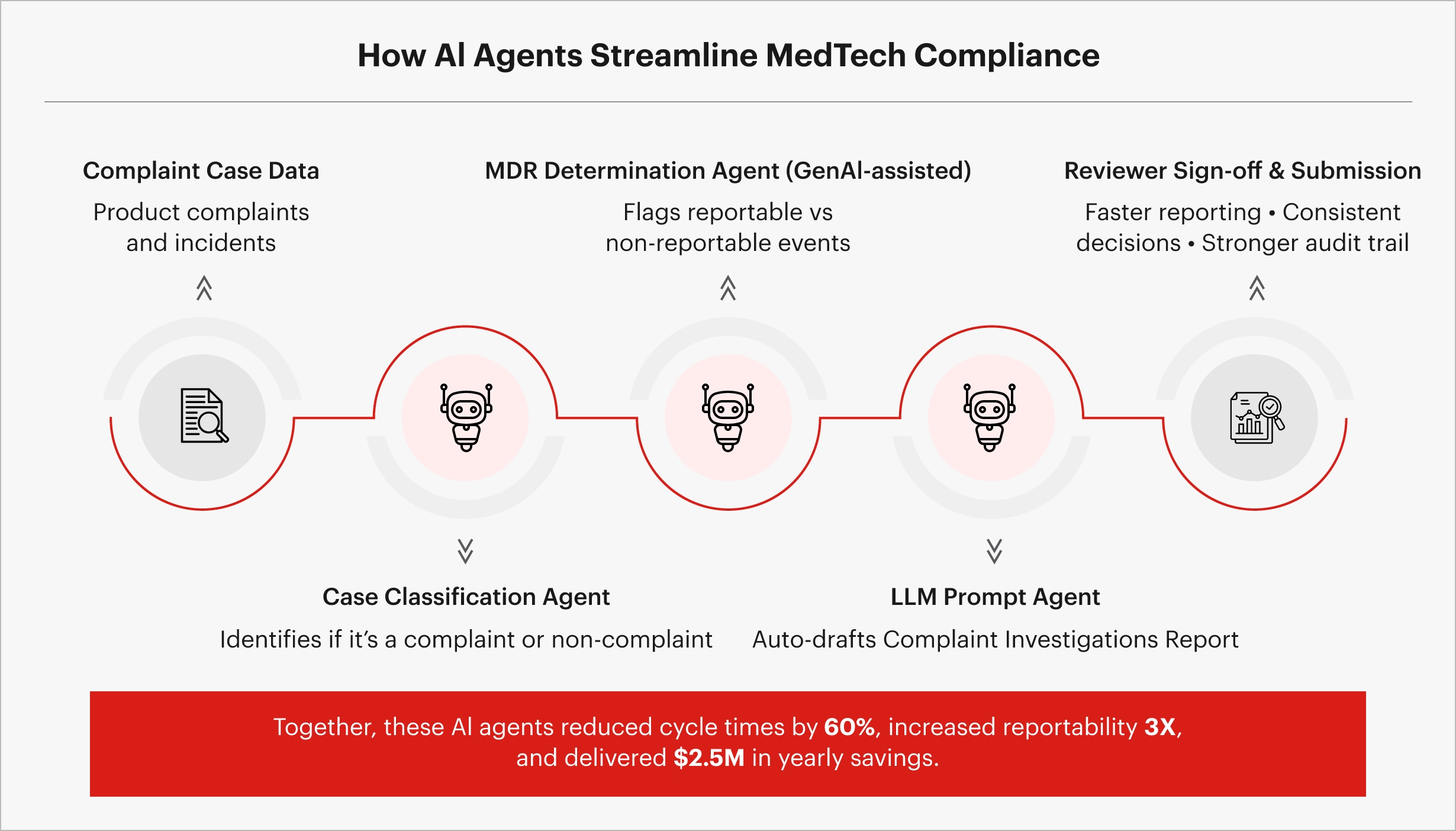 As compliance demands become increasingly data-intensive, traditional manual processes can no longer match the scale and speed required. This is where AI agents, intelligent autonomous systems trained on regulatory frameworks, enterprise data, and domain-specific rules, are transforming the compliance landscape. By embedding intelligence directly into workflows, they help MedTech companies move from reactive to predictive compliance management.
