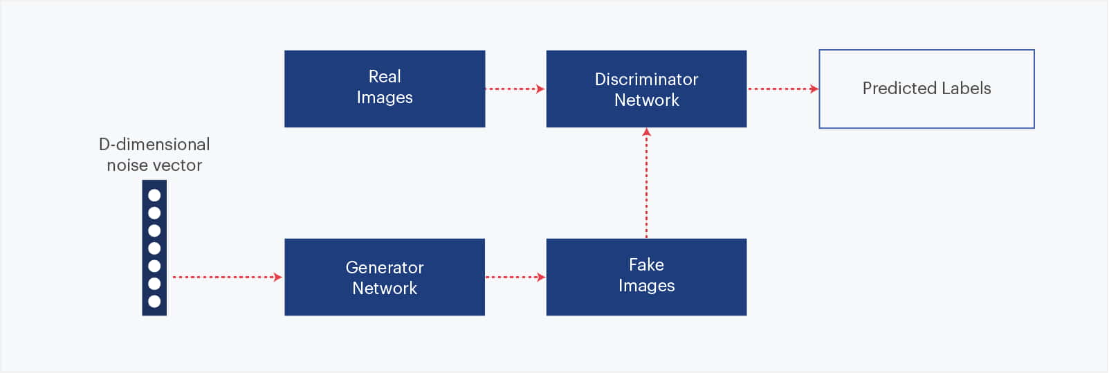 - Discriminator network (or adversary)—Takes as input an image (real or synthetic), and predicts whether the image came from the training set or was created by the generator network.