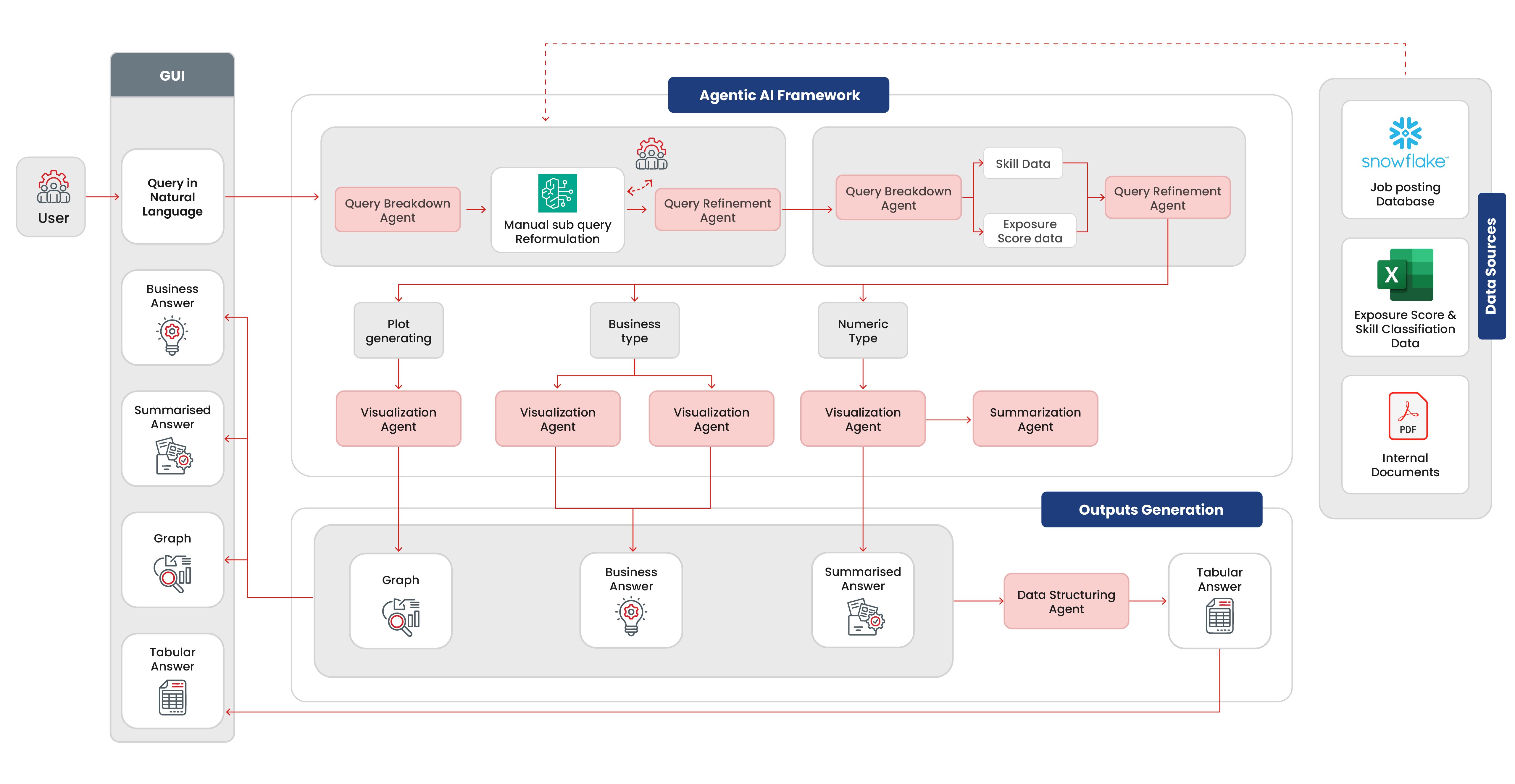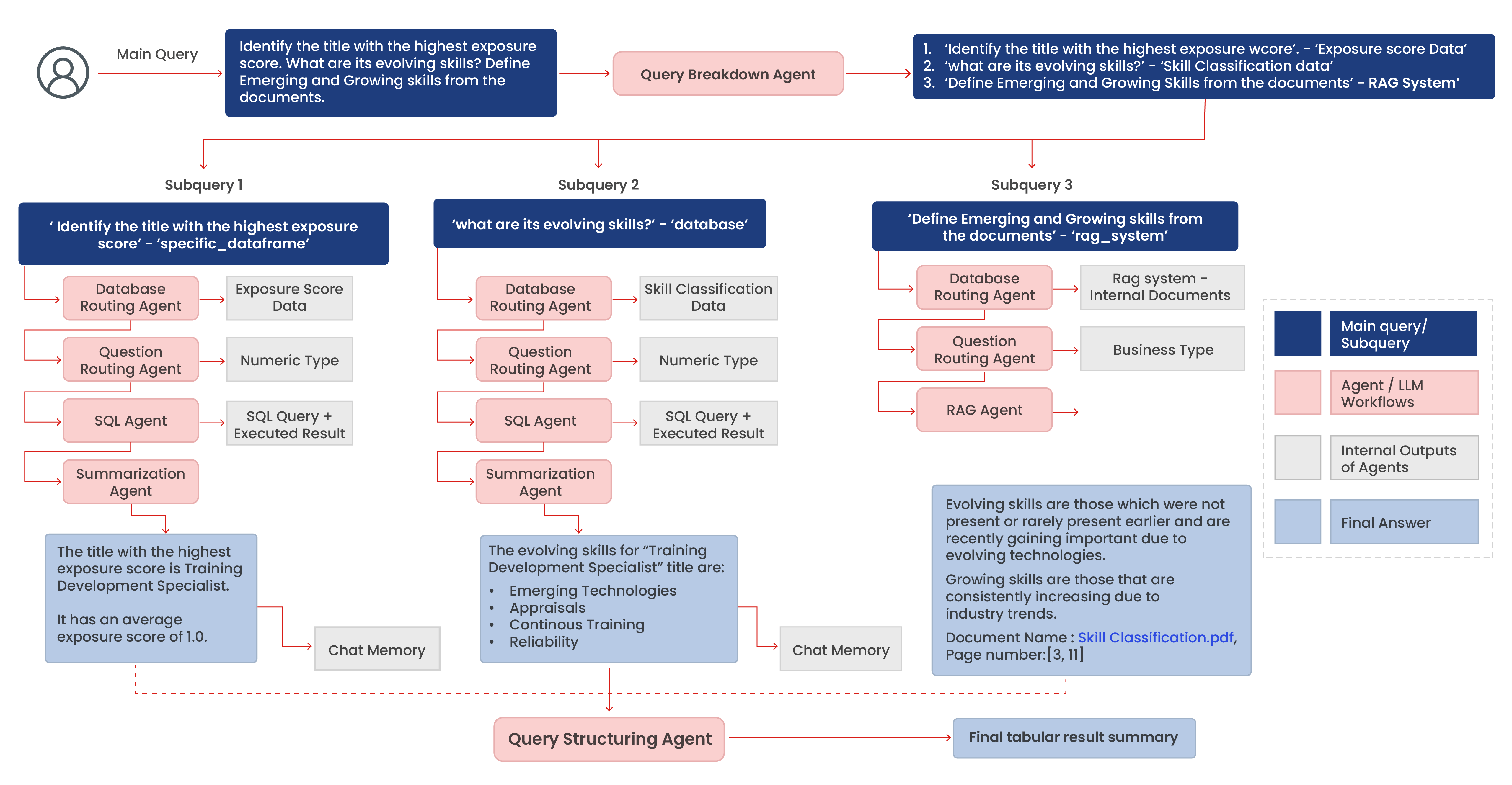 - Database Routing Agent selects the appropriate data source between structured databases or unstructured documents.